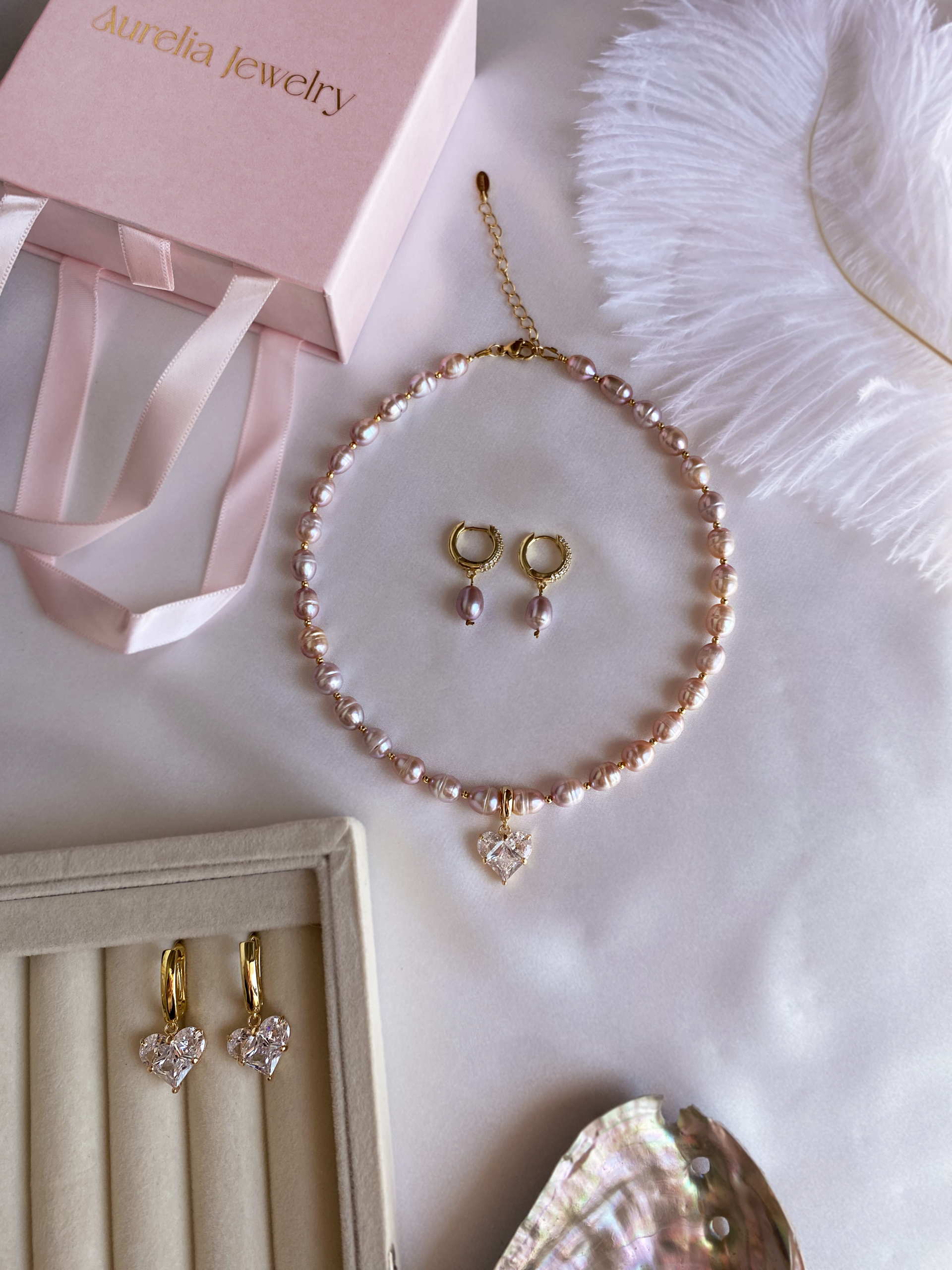 A delicate natural pink pearl choker necklace featuring a sparkling crystal heart centerpiece.